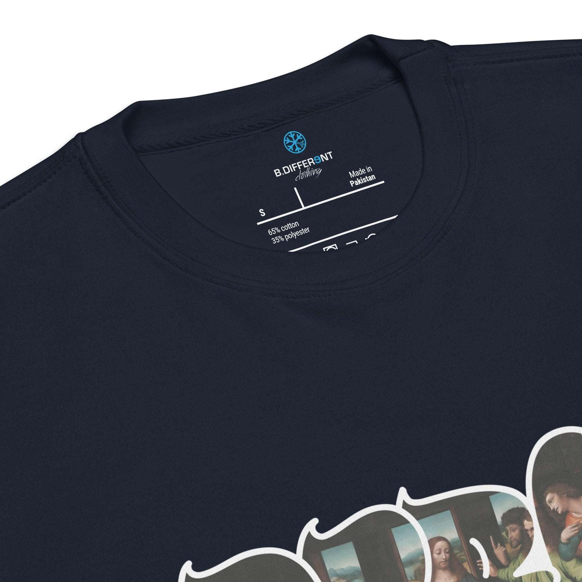This graffiti sweatshirt fuses graffiti with fine art, featuring a BDFRNT graffiti throw-up filled with Leonardo Da Vinci’s The Last Supper. This design merges the raw energy of graffiti with the timeless beauty of classical masterpieces, embodying the rebellious spirit of creativity that defines B.Different Clothing.