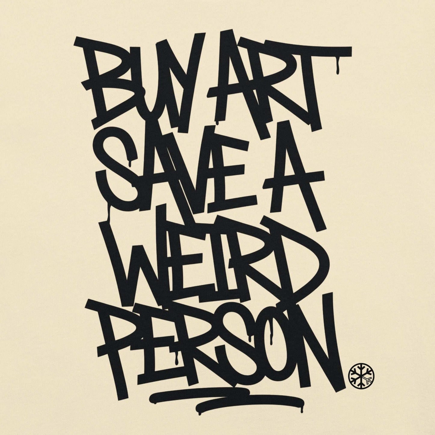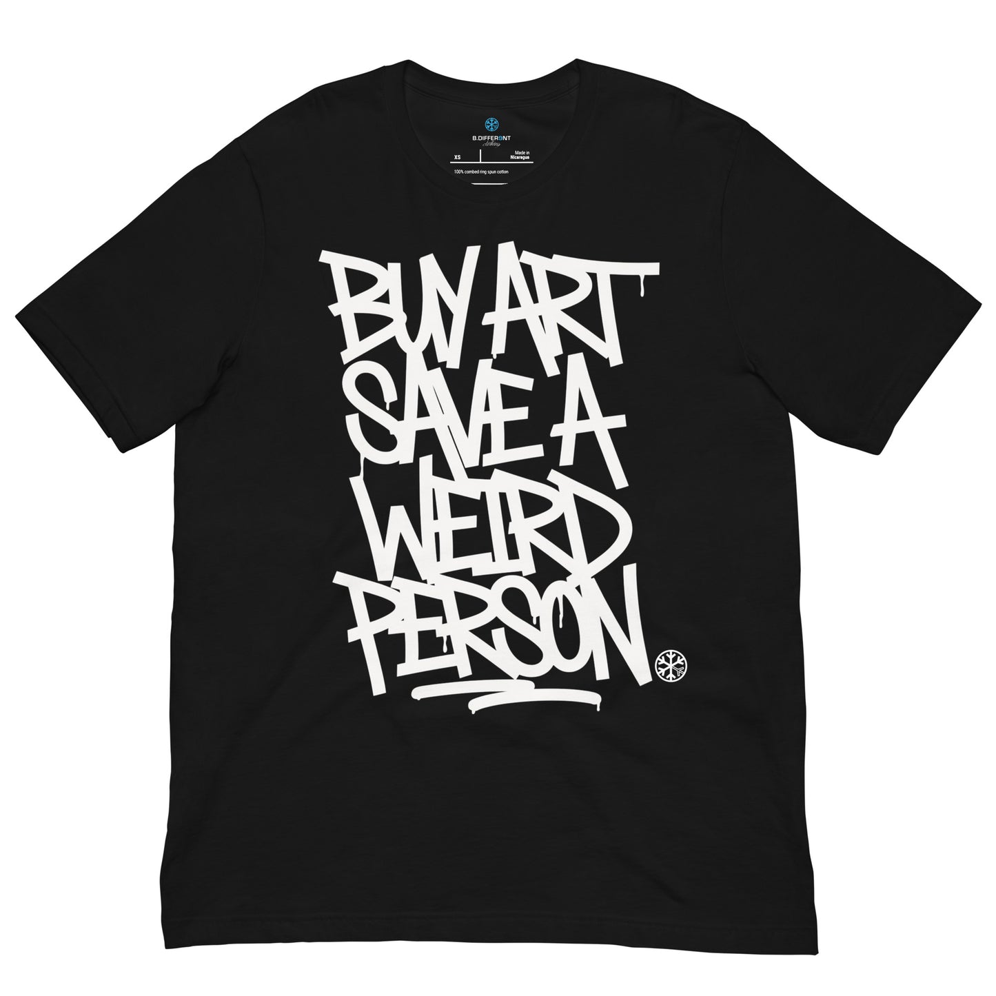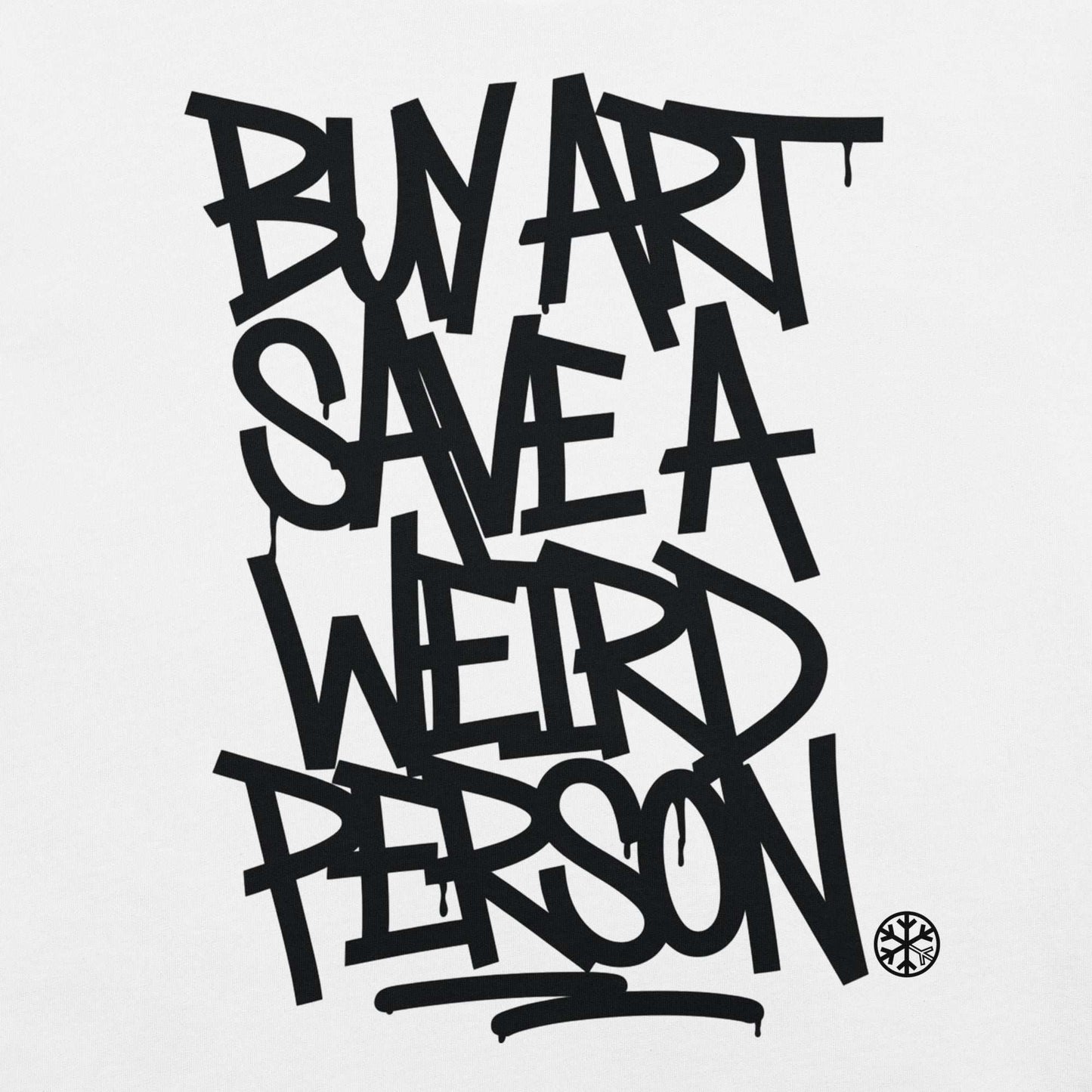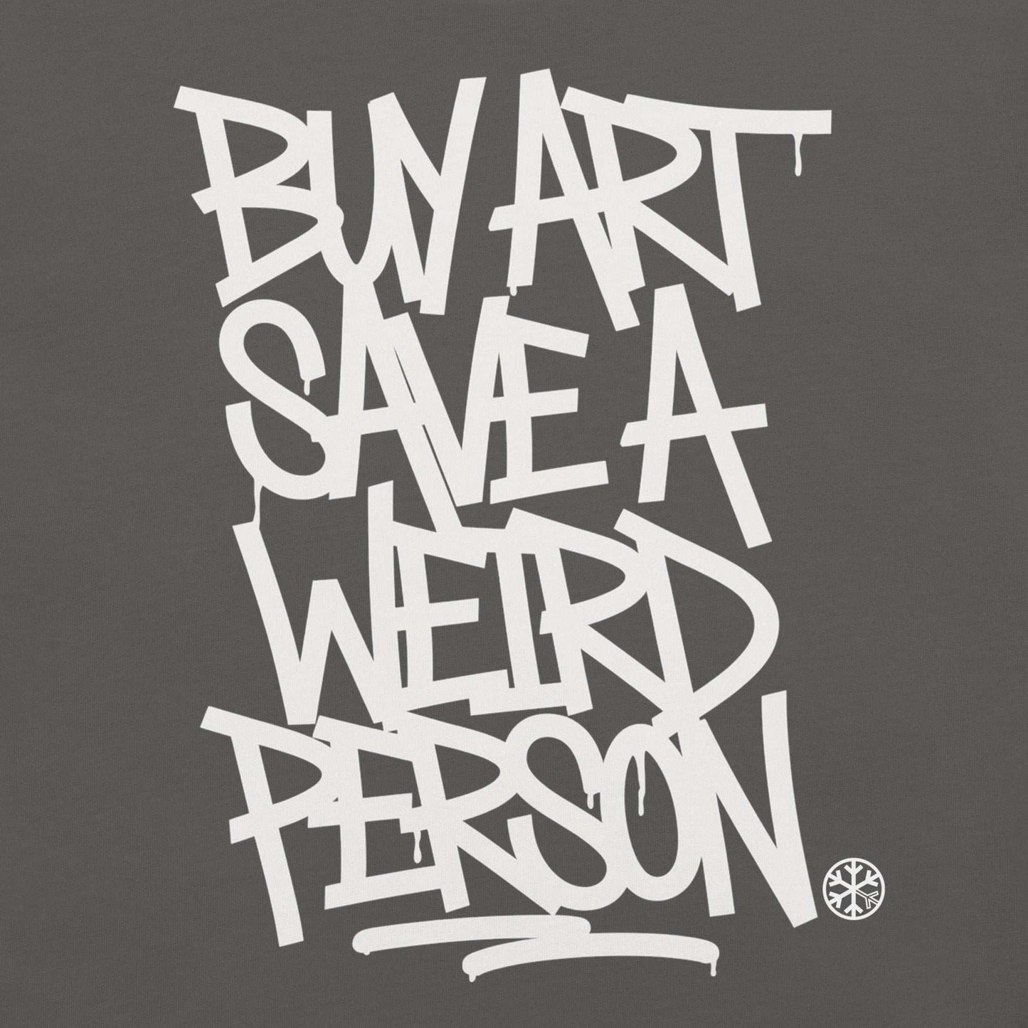 Wear the message. Fund the madness. This graffiti t-shirt is your reminder that buying art doesn’t just decorate walls—it keeps the weird ones alive and thriving. Buy art, save a weird person. (Yes, like us.)