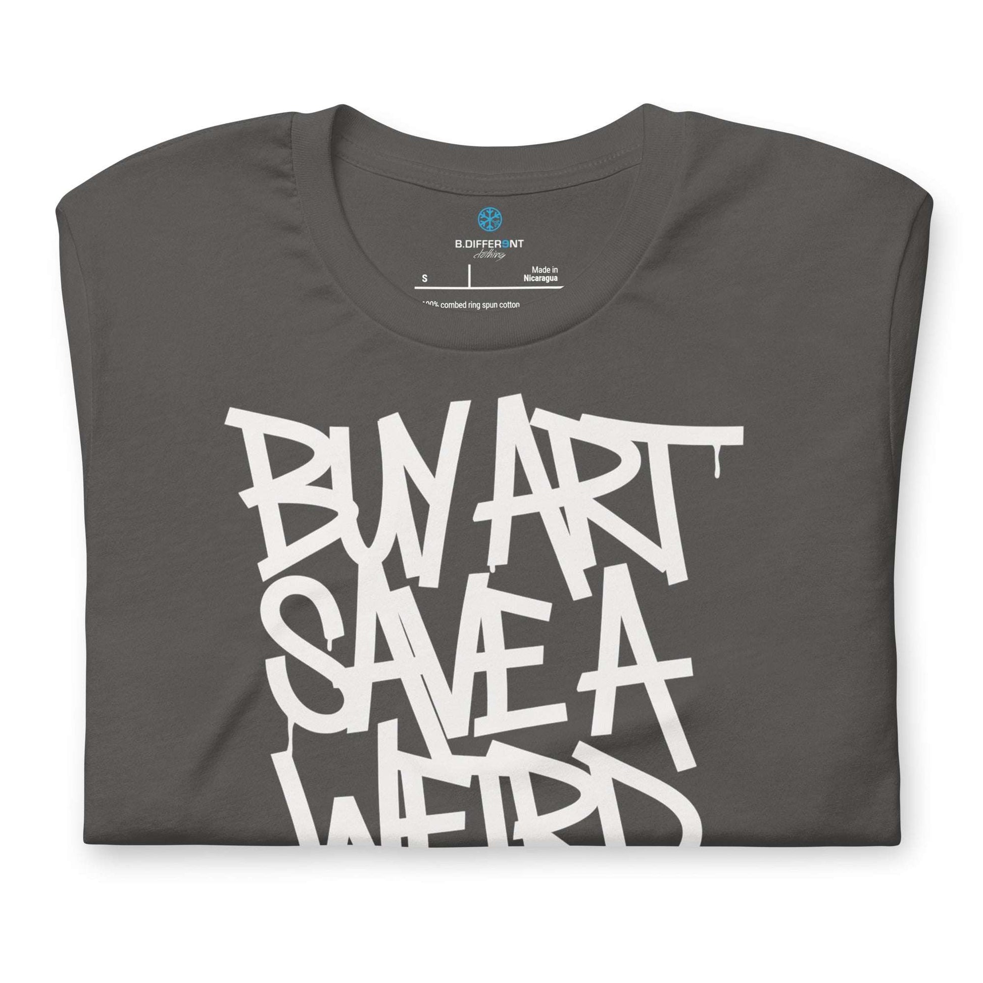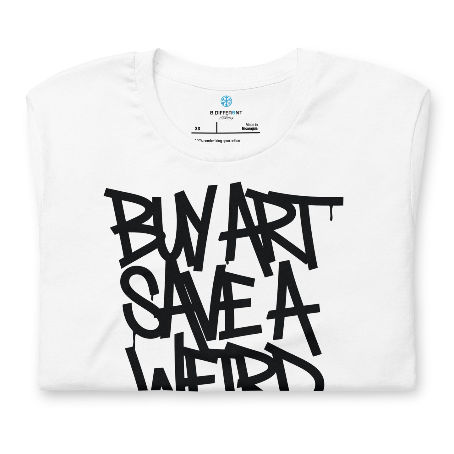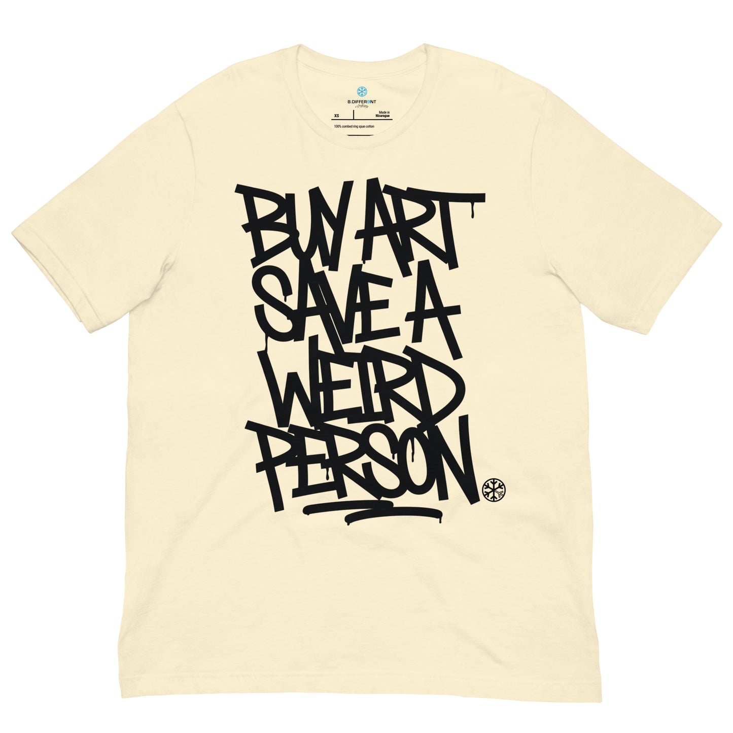 Wear the message. Fund the madness. This graffiti t-shirt is your reminder that buying art doesn’t just decorate walls—it keeps the weird ones alive and thriving. Buy art, save a weird person. (Yes, like us.)