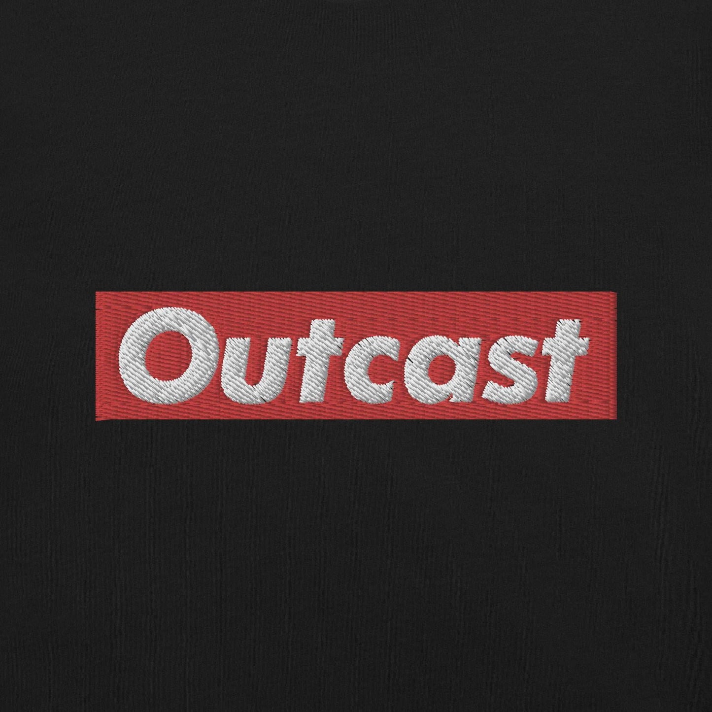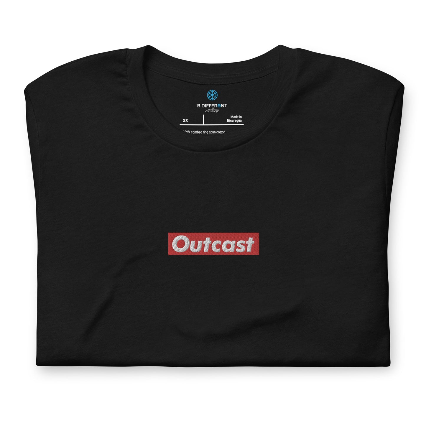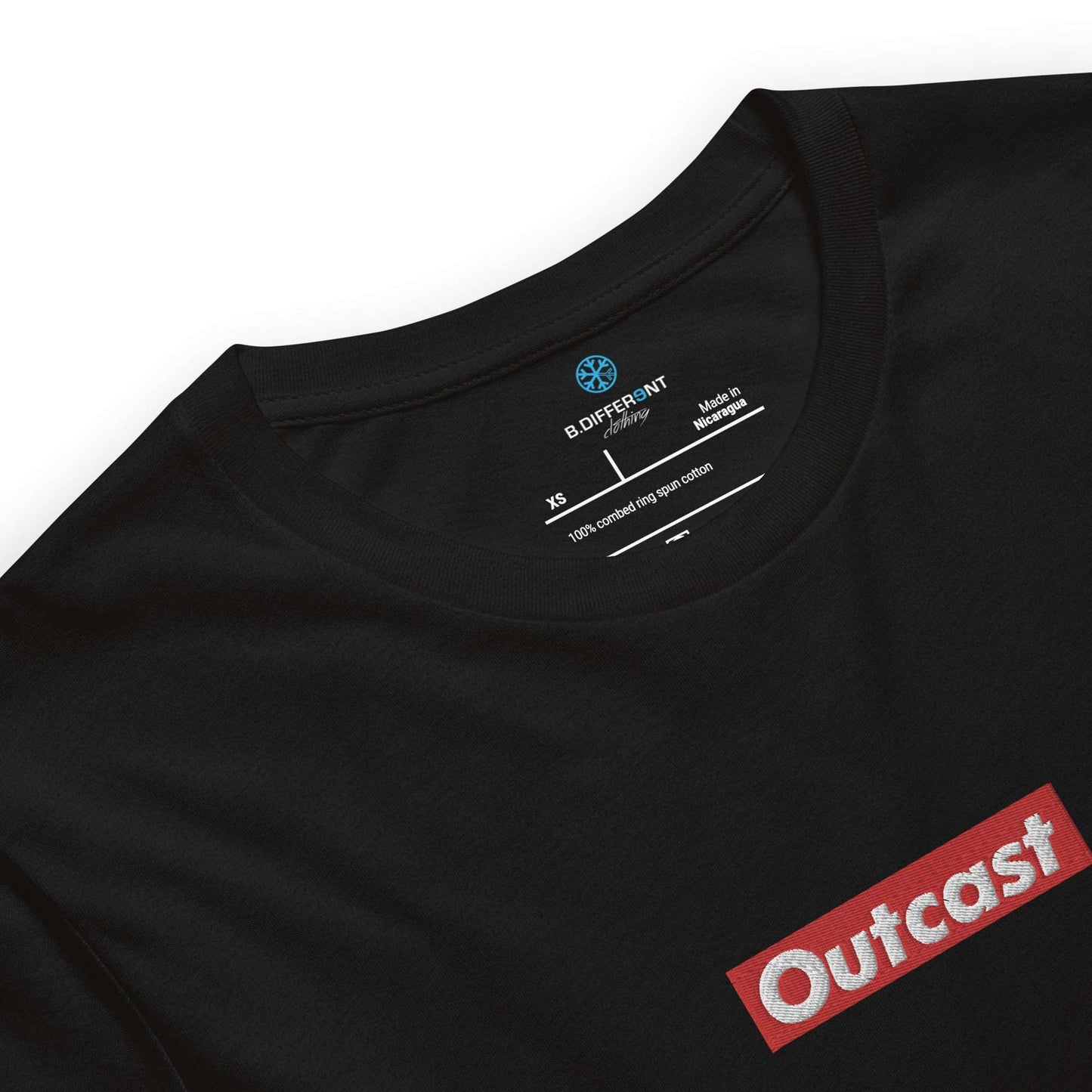 This t-shirt has two graphics, the outcast box on the middle of the chest, and our snowflake logo on the right sleeve, both of them are embroidered!