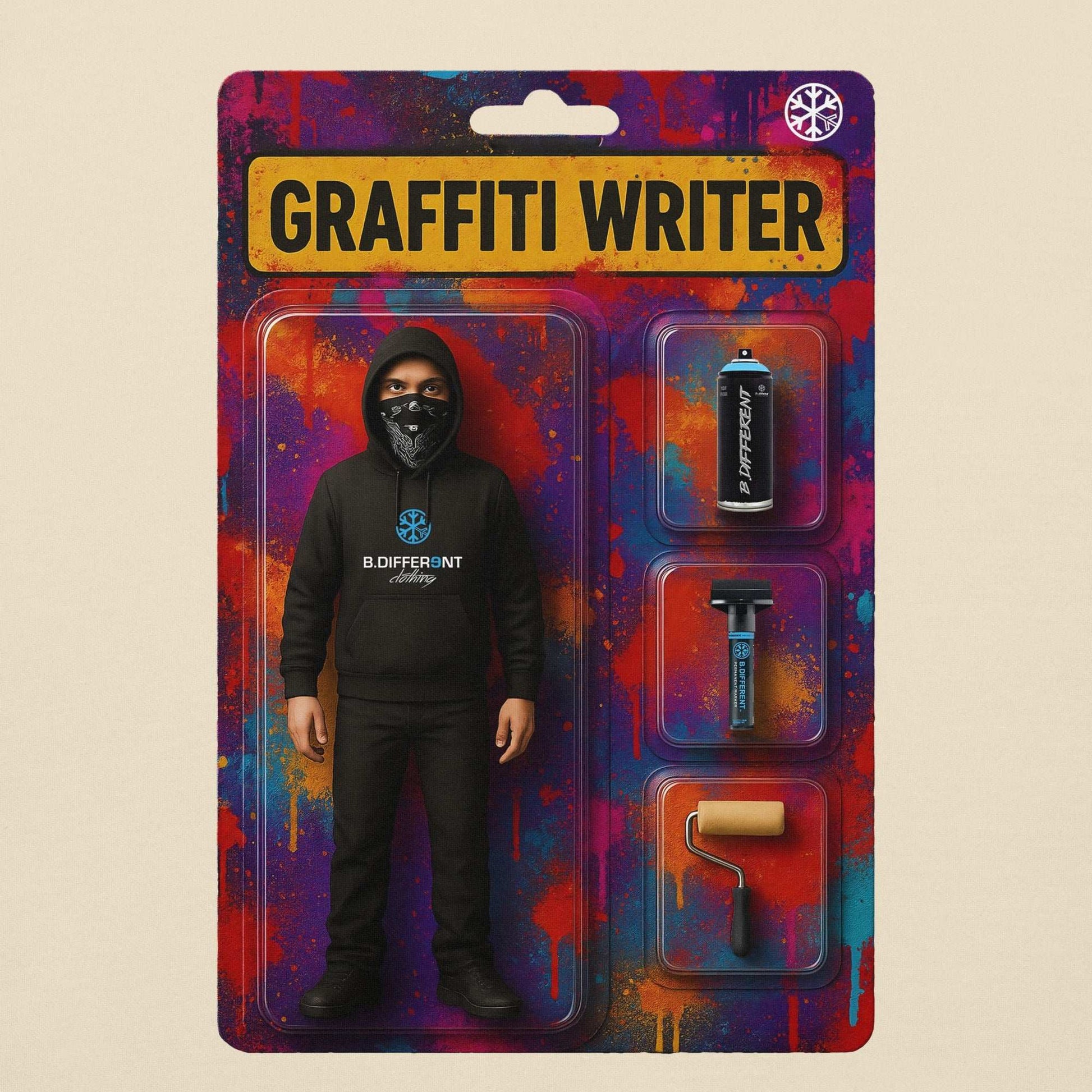 Ever wondered what’d happen if graffiti artists fell into a toy factory? Boom—plastic arms, permanent scowls, and spray cans, markers, and paint rollers for hands. This graffiti hoodie brings your favorite vandal to life as an action figure, minus the choking hazard!