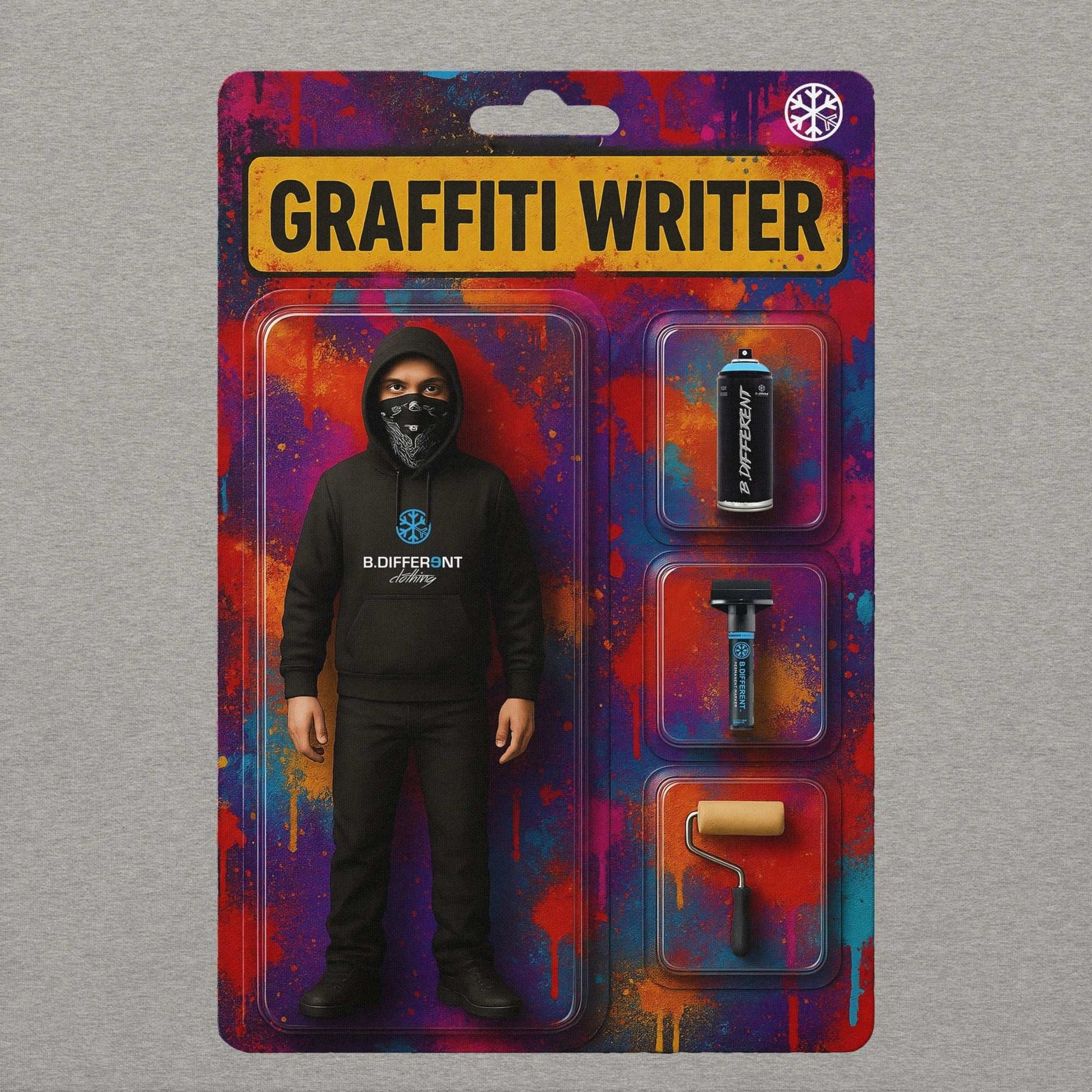 Ever wondered what’d happen if graffiti artists fell into a toy factory? Boom—plastic arms, permanent scowls, and spray cans, markers, and paint rollers for hands. This graffiti sweatshirt brings your favorite vandal to life as an action figure, minus the choking hazard!