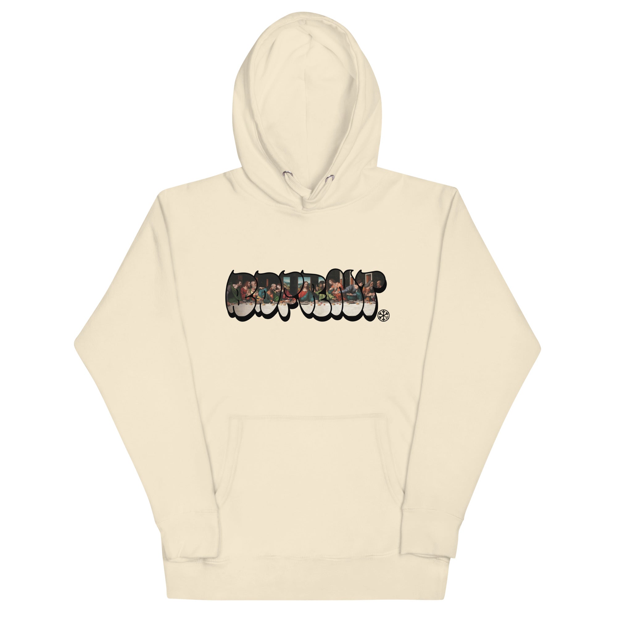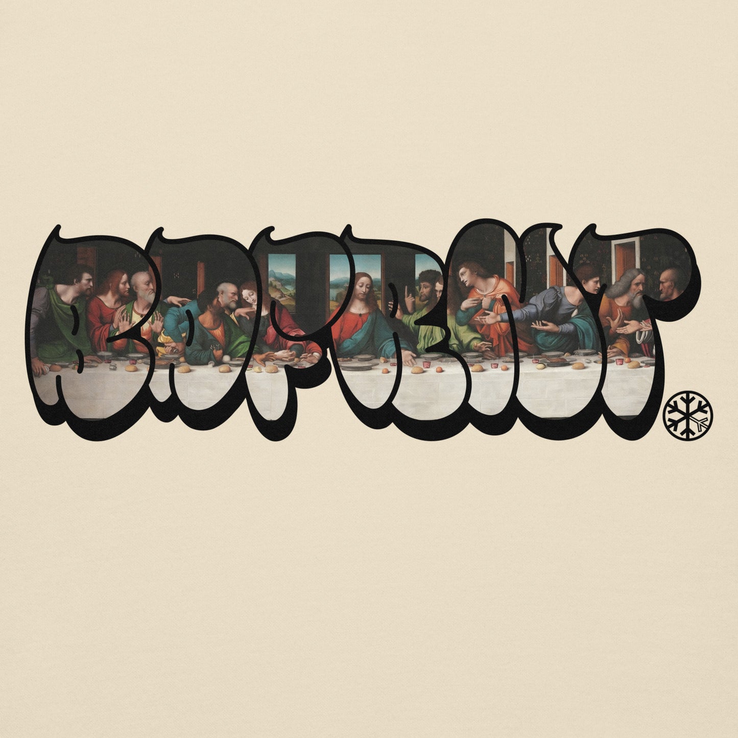 This graffiti hoodie fuses graffiti with fine art, featuring a BDFRNT graffiti throw-up filled with Leonardo Da Vinci’s The Last Supper. This design merges the raw energy of graffiti with the timeless beauty of classical masterpieces, embodying the rebellious spirit of creativity that defines B.Different Clothing.