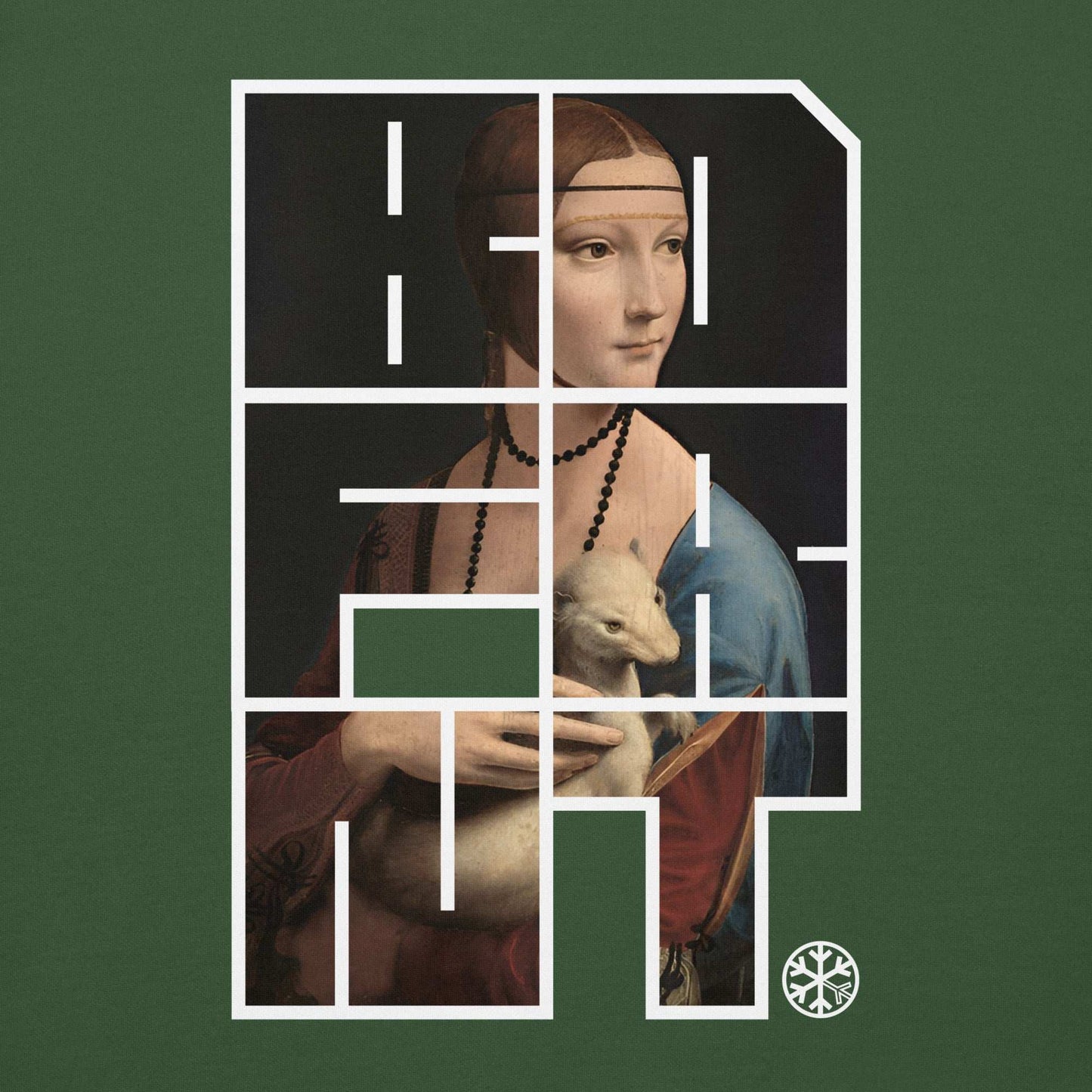 This graffiti sweatshirt fuses graffiti with fine art, featuring a BDFRNT graffiti blockbuster piece filled with Leonardo Da Vinci’s Lady With an Ermine. This design merges the raw energy of graffiti with the timeless beauty of classical masterpieces, embodying the rebellious spirit of creativity that defines B.Different Clothing.