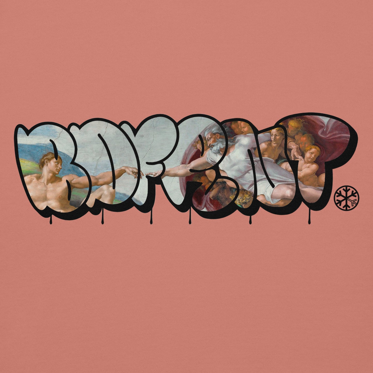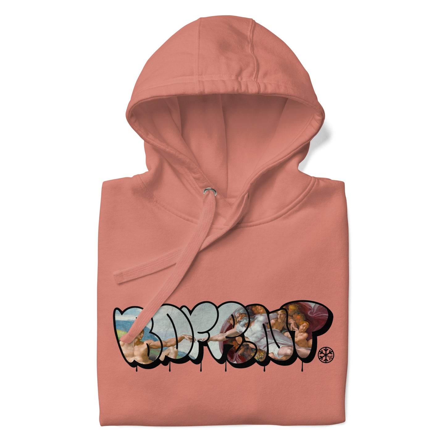 This graffiti hoodie fuses graffiti with fine art, featuring a BDFRNT graffiti throw-up filled with Michelangelo’s The Creation of Adam. This design merges the raw energy of graffiti with the timeless beauty of classical masterpieces, embodying the rebellious spirit of creativity that defines B.Different Clothing.