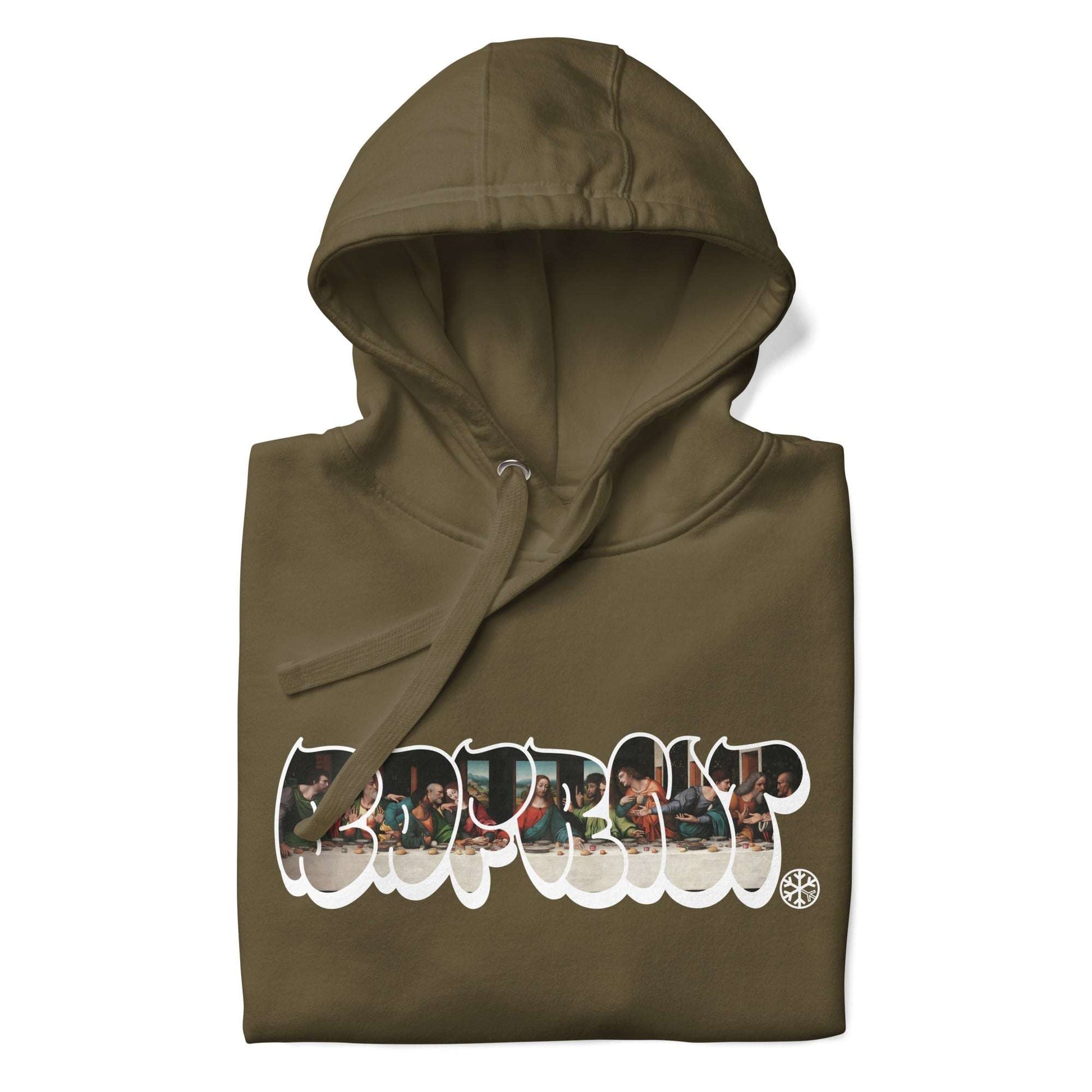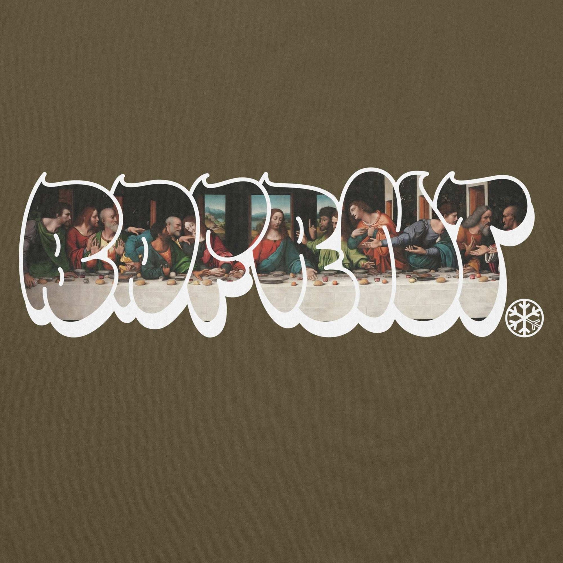 This graffiti hoodie fuses graffiti with fine art, featuring a BDFRNT graffiti throw-up filled with Leonardo Da Vinci’s The Last Supper. This design merges the raw energy of graffiti with the timeless beauty of classical masterpieces, embodying the rebellious spirit of creativity that defines B.Different Clothing.