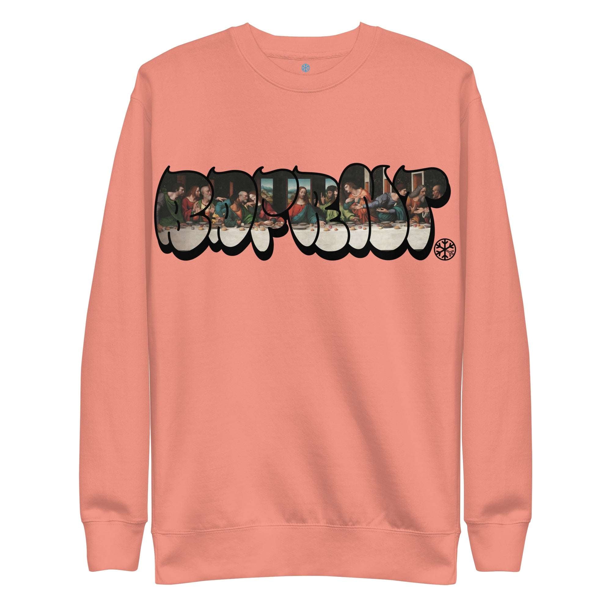 This graffiti sweatshirt fuses graffiti with fine art, featuring a BDFRNT graffiti throw-up filled with Leonardo Da Vinci’s The Last Supper. This design merges the raw energy of graffiti with the timeless beauty of classical masterpieces, embodying the rebellious spirit of creativity that defines B.Different Clothing.