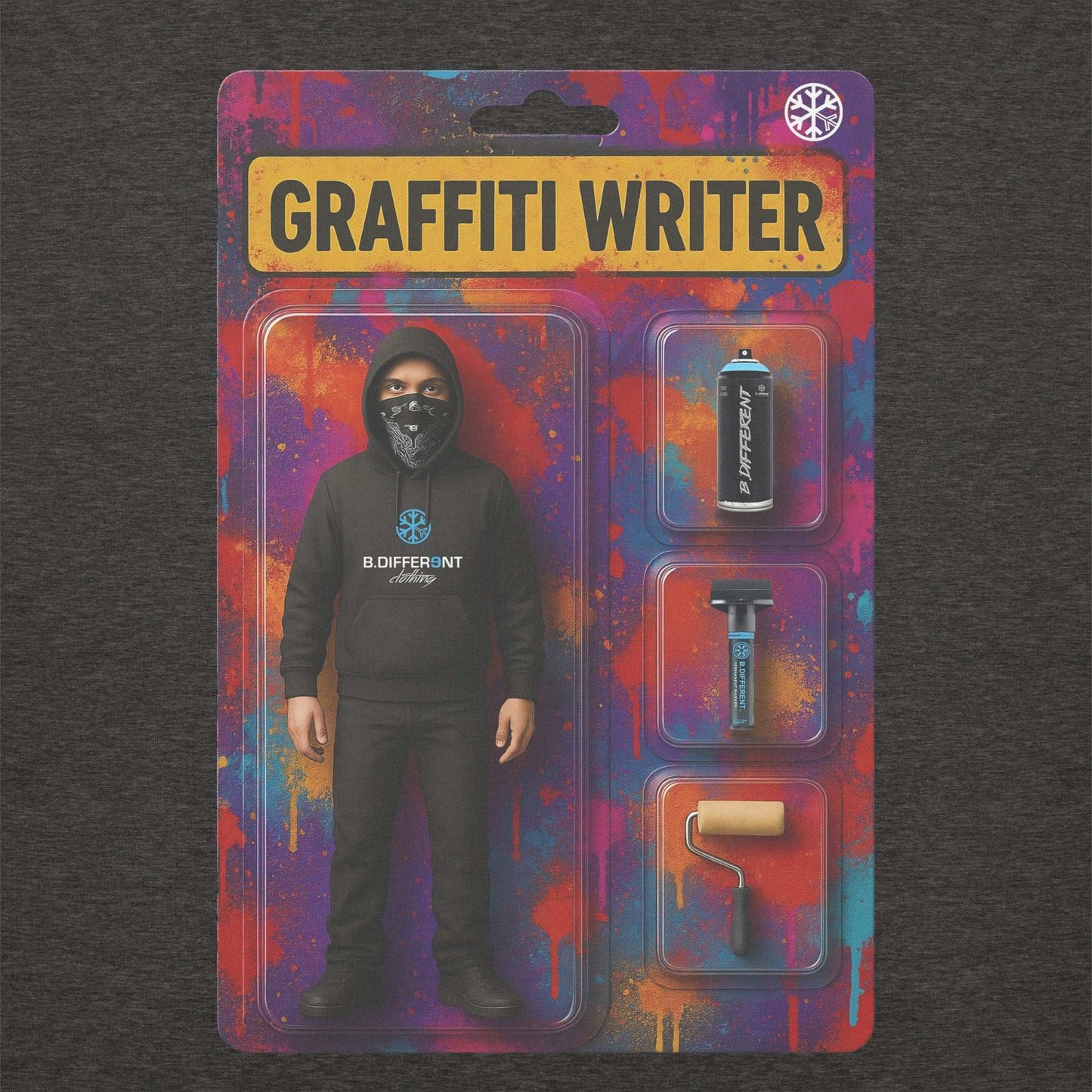Ever wondered what’d happen if graffiti artists fell into a toy factory? Boom—plastic arms, permanent scowls, and spray cans, markers, and paint rollers for hands. This graffiti sweatshirt brings your favorite vandal to life as an action figure, minus the choking hazard!